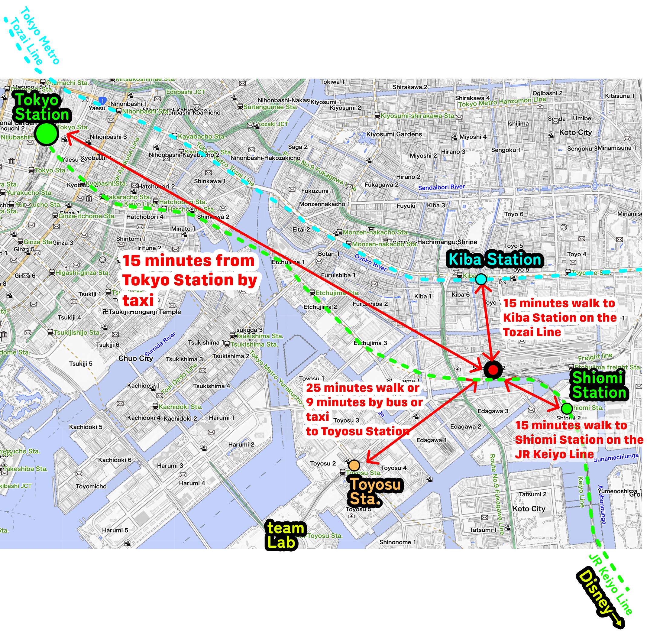 ・Yurakucho Line/Yurikamome Toyosu Station: 25 minutes on foot (10 minutes by bus)