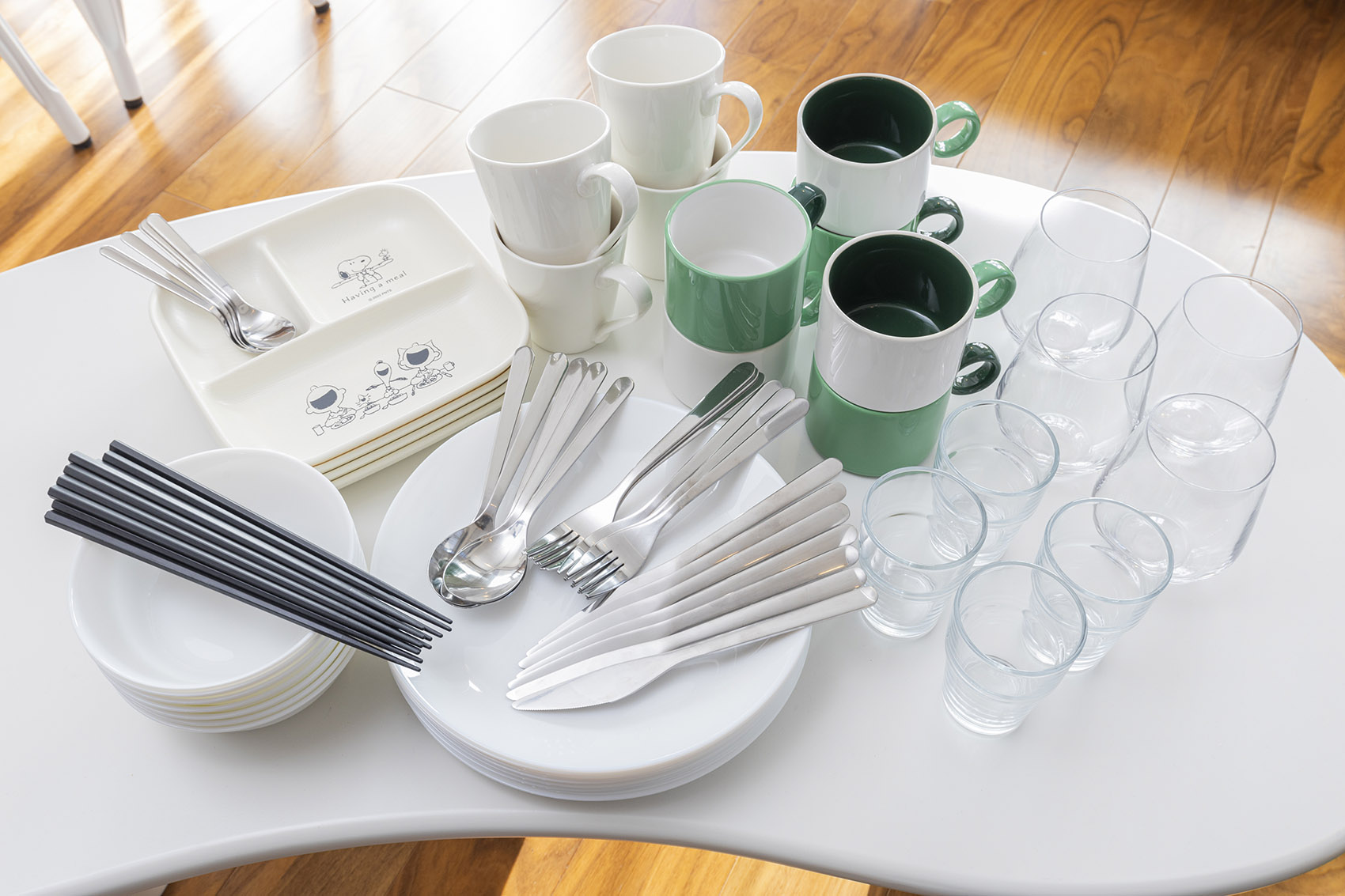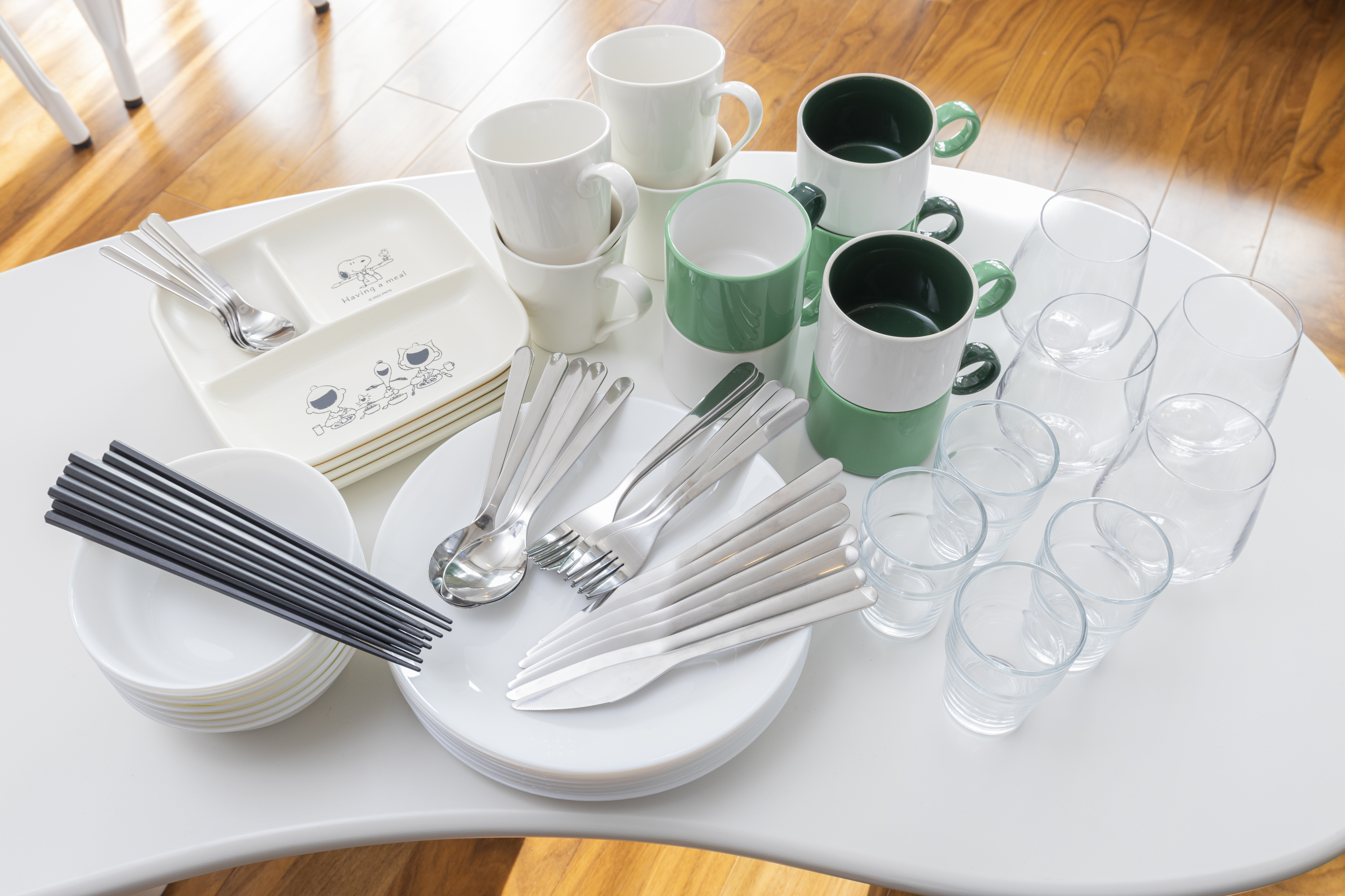 Flat plates, deep plates, children’s dishes, mugs, glasses, spoons, forks, chopsticks, etc.