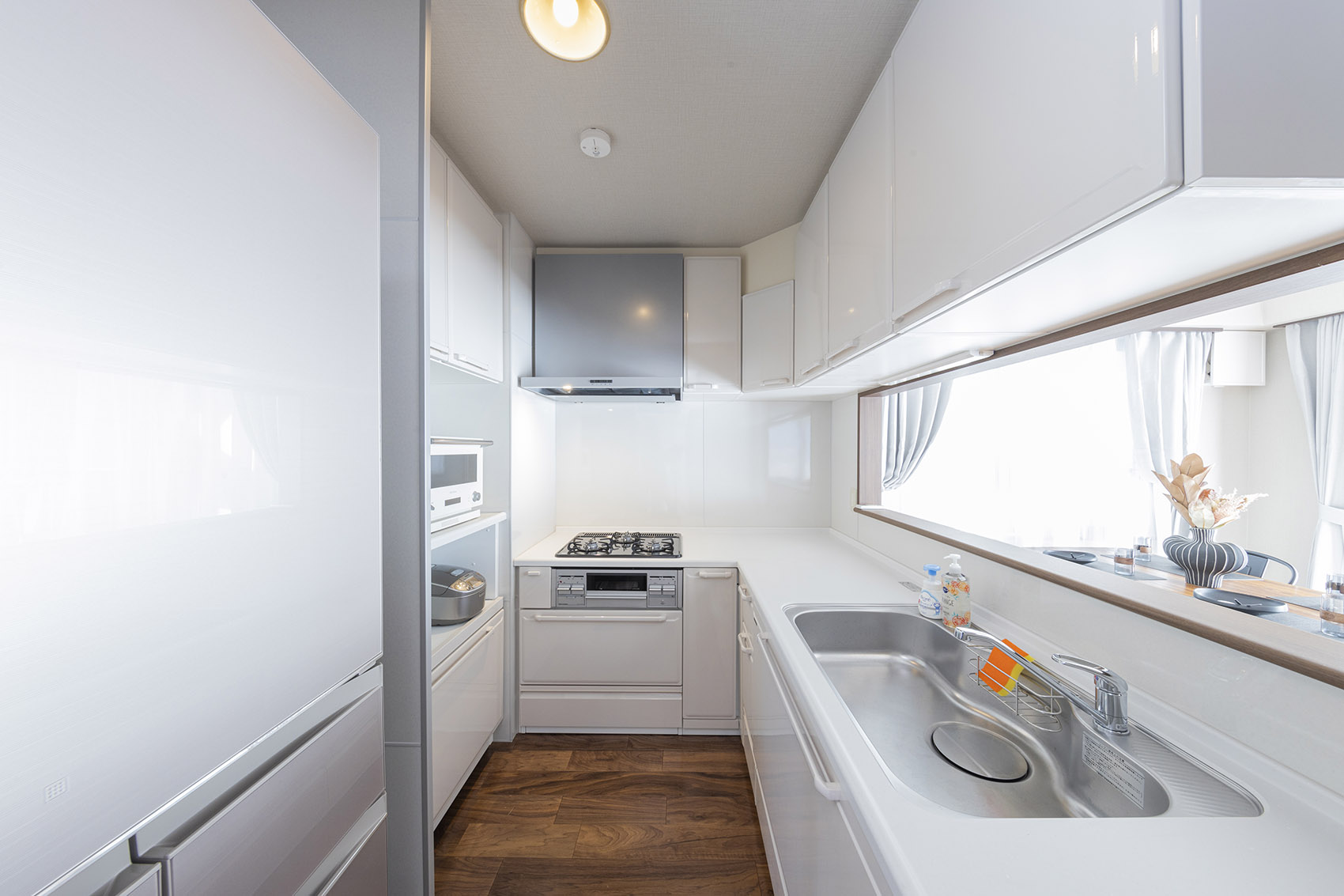 refrigerator, rice cooker, microwave, electric kettle, Frying pans, pots (including a large pot), cutting boards, kitchen knives, mixing bowls, strainers, cooking chopsticks, tongs, spatulas, ladles, slotted ladles, peelers, measuring cups, kitchen scissors, rice paddles, wine openers, and bottle openers.Flat plates, deep plates, children’s dishes, mugs, glasses, spoons, forks, chopsticks, etc.