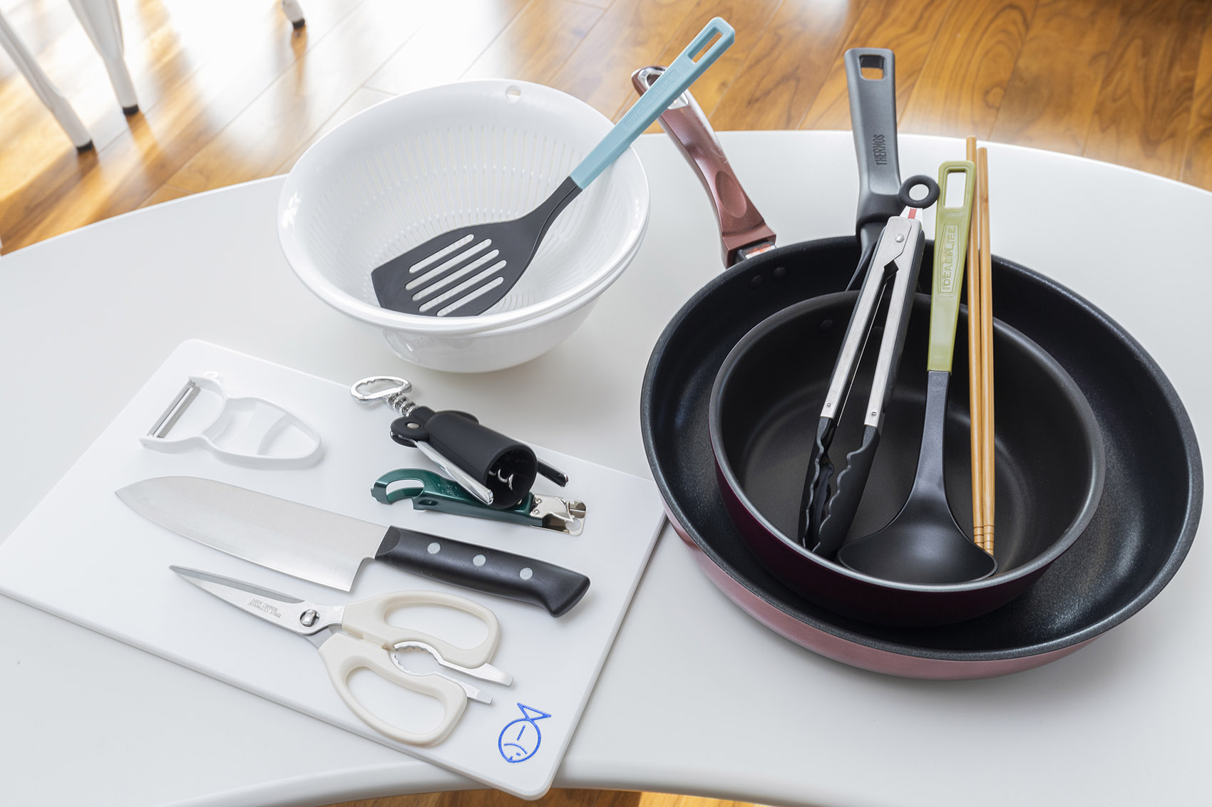 Frying pans, pots (including a large pot), cutting boards, kitchen knives, mixing bowls, strainers, cooking chopsticks, tongs, spatulas, ladles, slotted ladles, peelers, measuring cups, kitchen scissors, rice paddles, wine openers, and bottle openers.